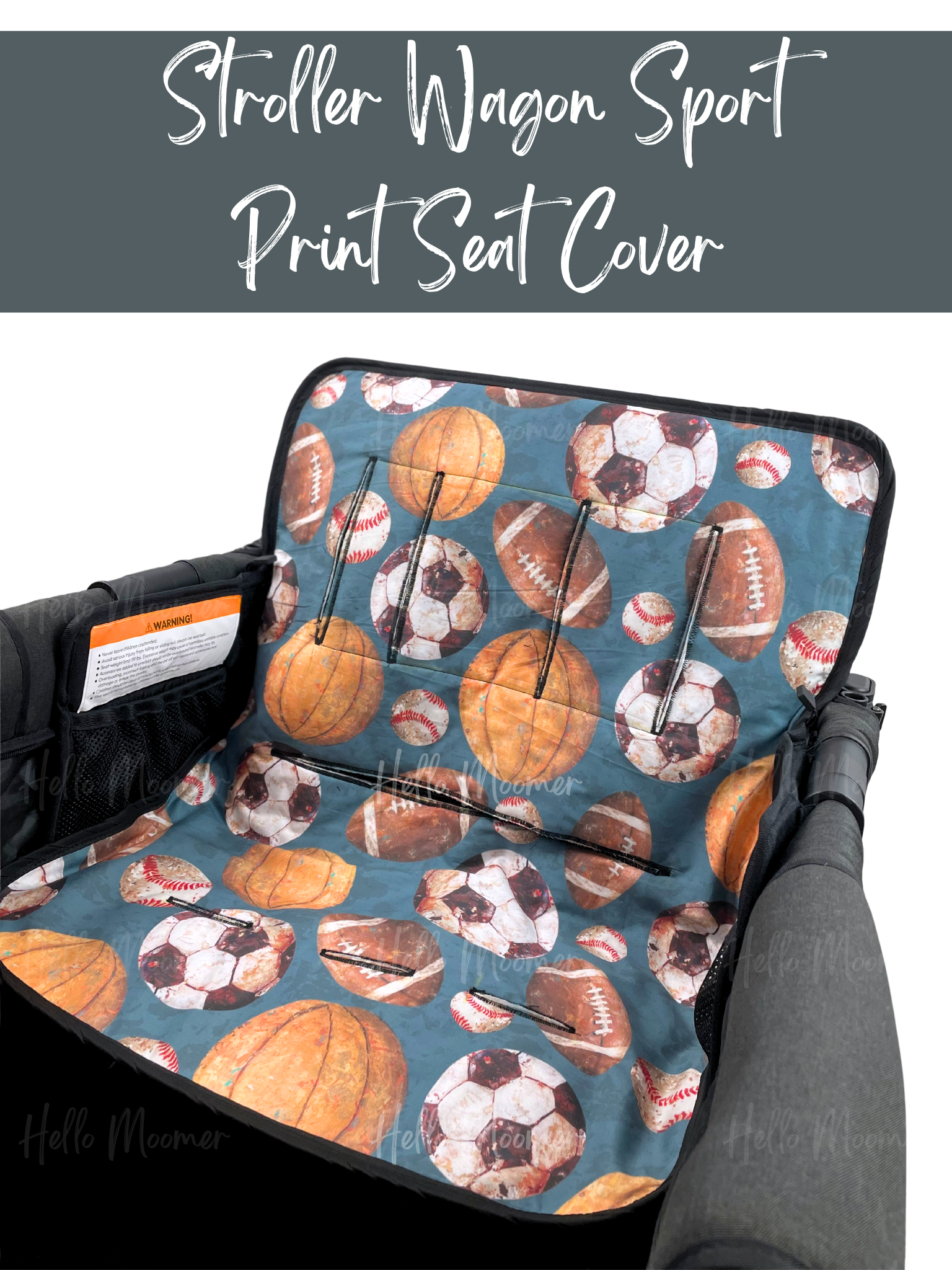 Score big style points for your stroller wagon! This single seat cover features an energetic all-over print of footballs, basketballs, and soccer balls—perfect for little sports fans on the go. Crafted with a soft, breathable cotton front and back, it offers comfort while being gentle on sensitive skin. The sleek black binding adds a clean, durable finish that holds up to everyday use.